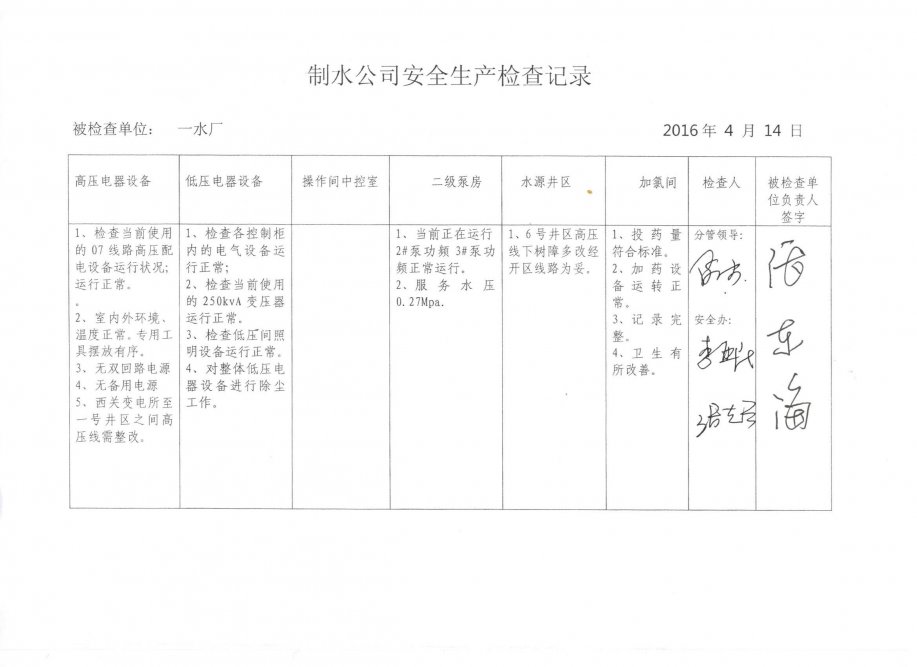 一水厂2016年4月安全生产检查记录
