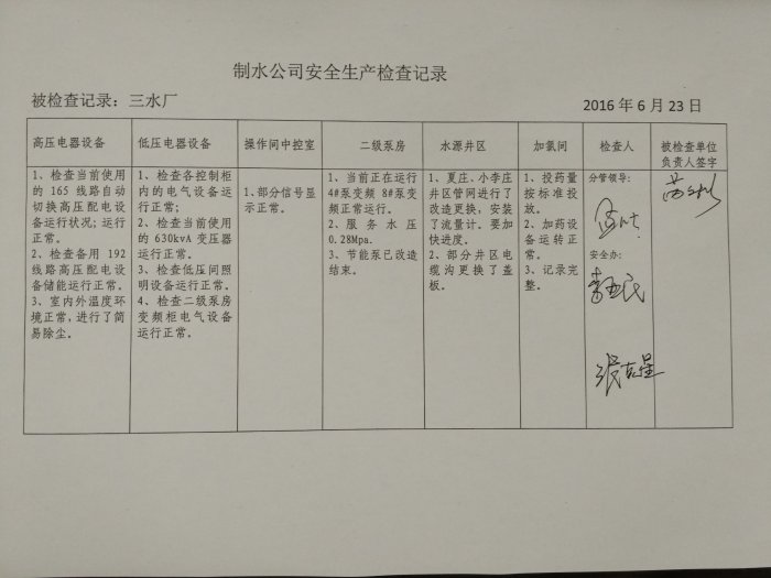 三水厂2016年6月安全生产检查记录
