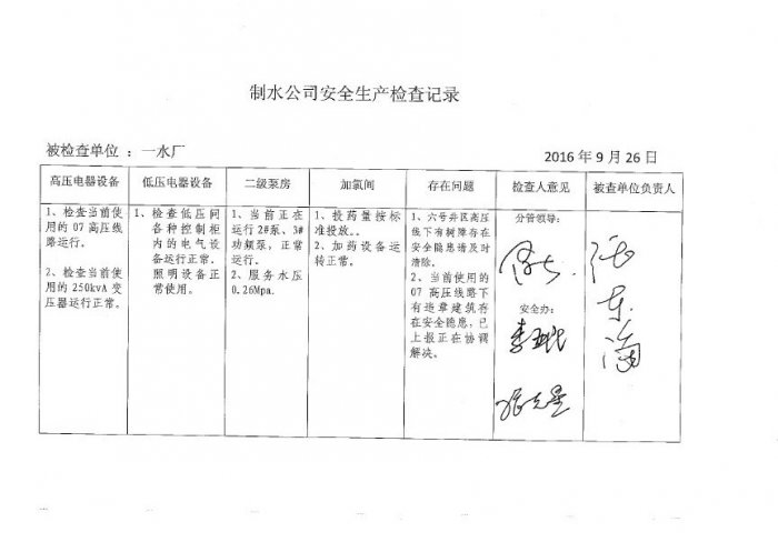 一水厂2016年9月安全生产检查记录