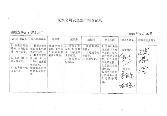 涡北水厂2016年9月安全生产检查记录