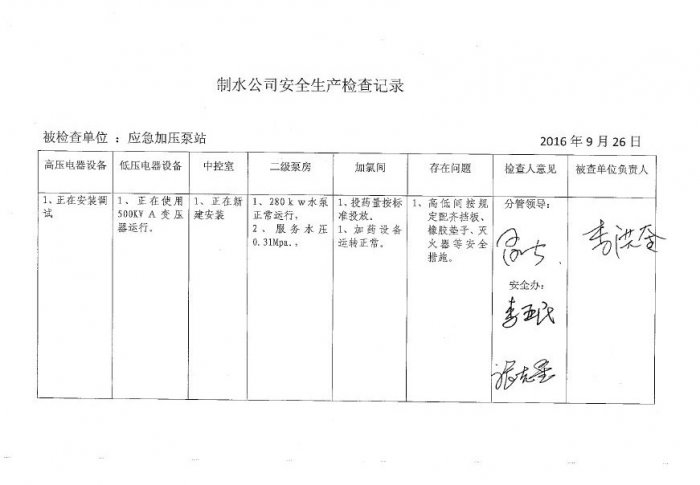 应急加压泵站2016年9月安全生产检查记录