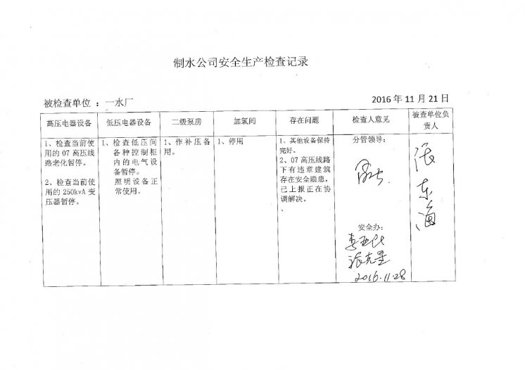 一水厂2016年11月安全生产检查记录