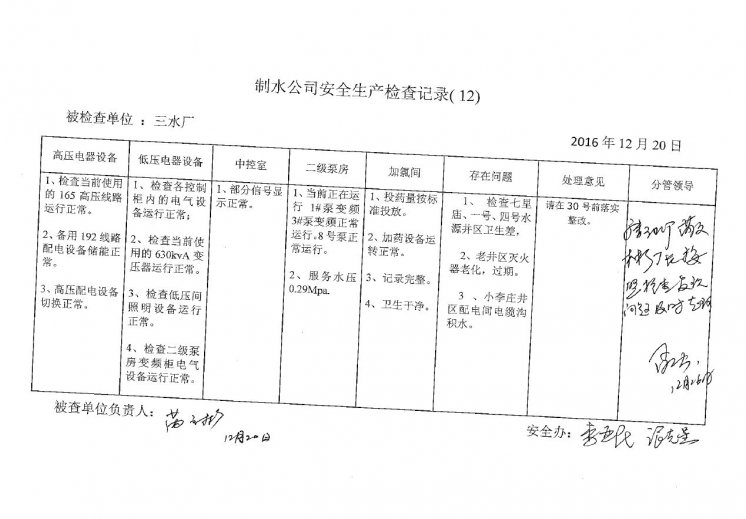 三水厂2016年12月安全生产检查记录