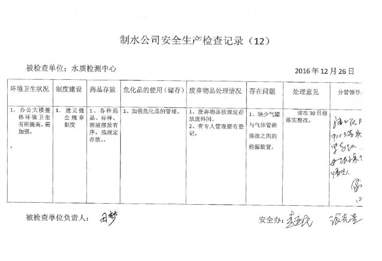 水质检测中心2016年12月安全生产检查记录