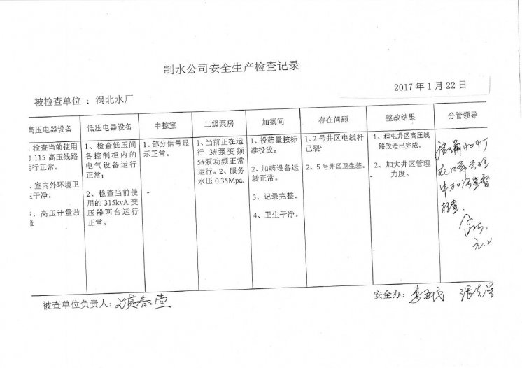 涡北水厂2017年1月安全生产检查记录