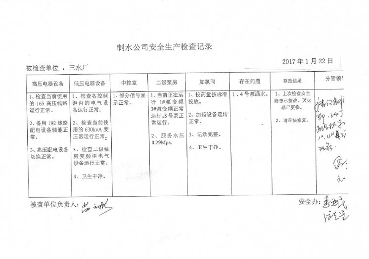 三水厂2017年1月安全生产检查记录