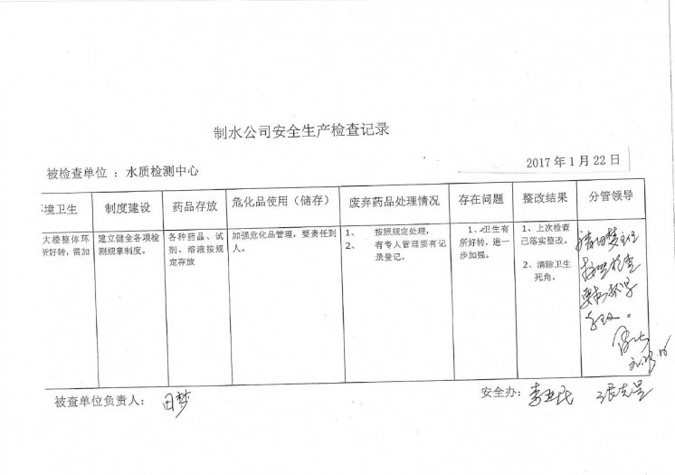 水质检测中心2017年1月安全生产检查记录