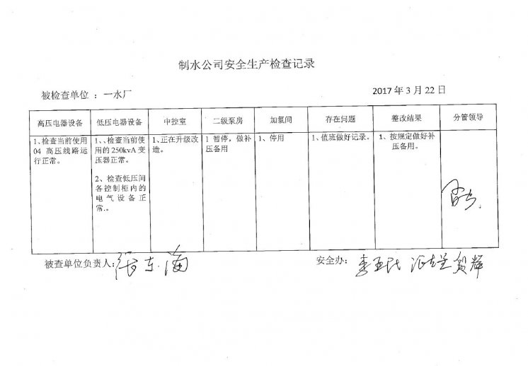 一水厂2017年3月安全生产检查记录
