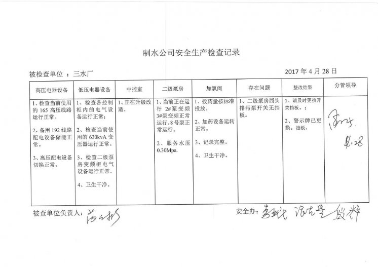 三水厂2017年4月安全生产检查记录