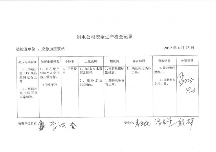 加压泵站2017年4月安全生产检查记录
