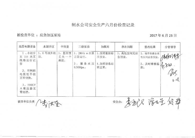 加压泵站2017年6月安全生产检查记录