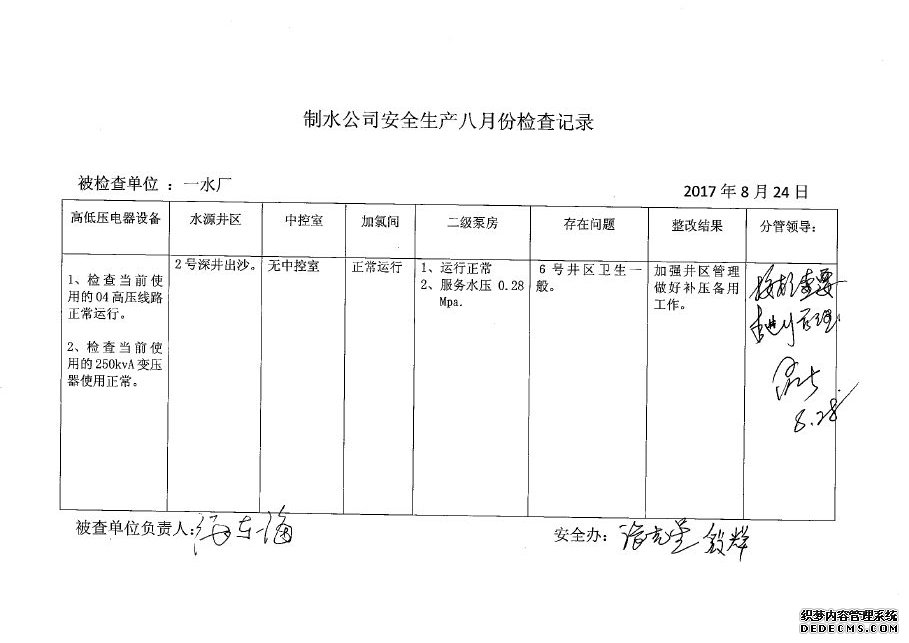 一水厂2017年8月安全生产检查记录