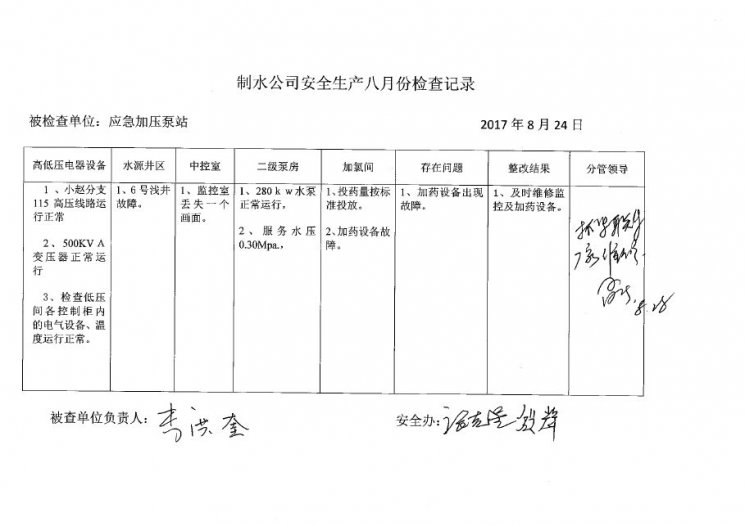 加压泵站2017年8月安全生产检查记录