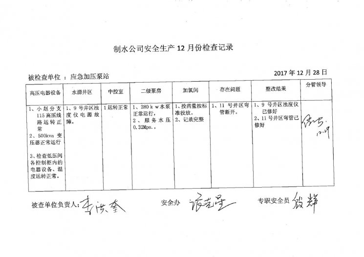 应急加压泵站2017年12月安全生产检查记录