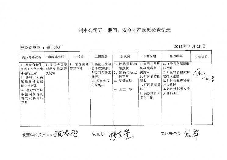 涡北水厂2018年4月安全生产检查记录