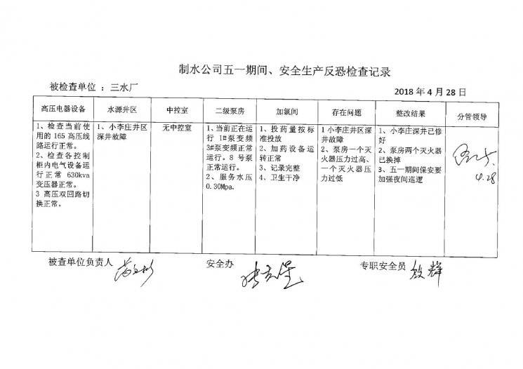 涡北水厂2018年4月安全生产检查记录