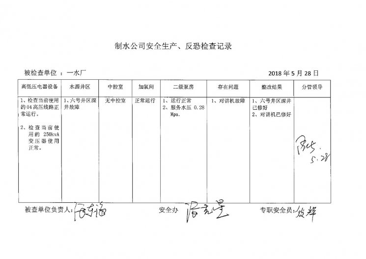 一水厂2018年5月安全生产检查记录