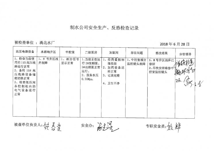 涡北水厂2018年6月安全生产检查记录