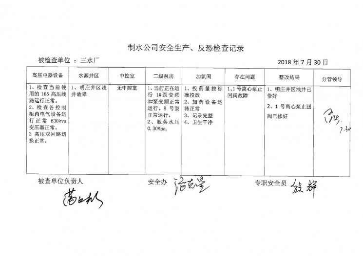 三水厂2018年7月安全生产检查记录