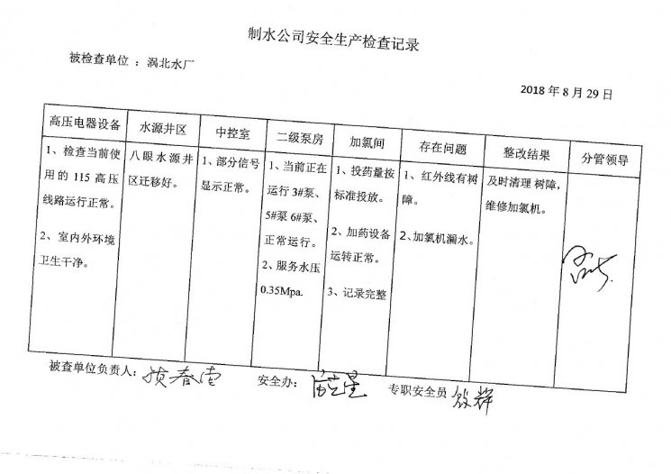 涡北水厂2018年8月安全生产检查记录