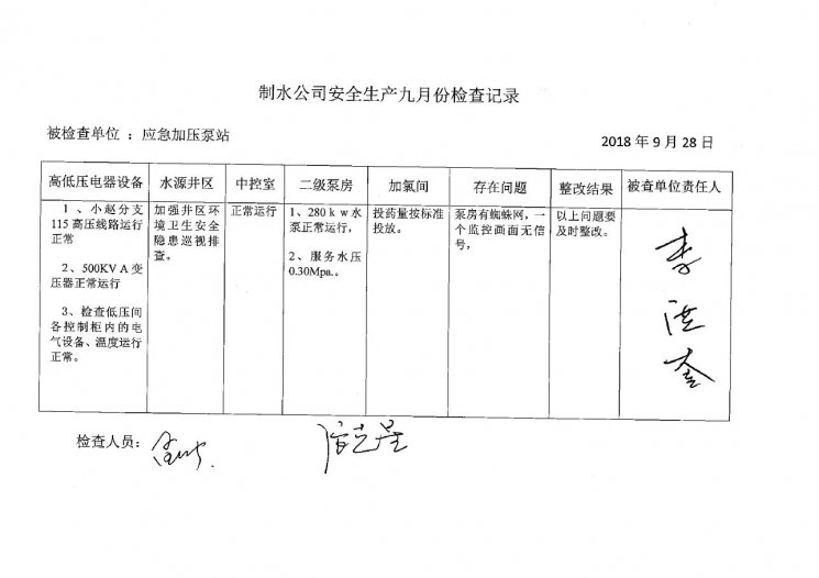 加压泵站2018年9月安全生产检查记录