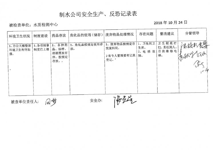 水质检测中心2018年10月安全生产检查记录