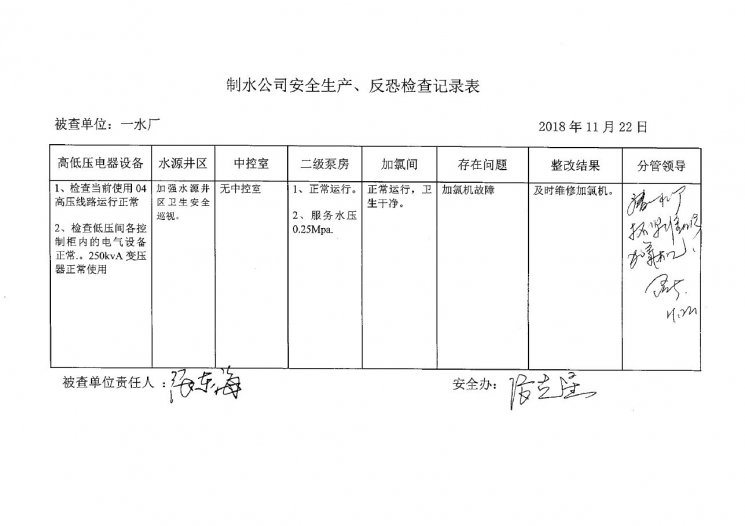 一水厂2018年11月安全生产检查记录
