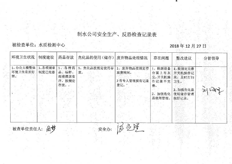 水质检测中心2018年12月安全生产检查记录