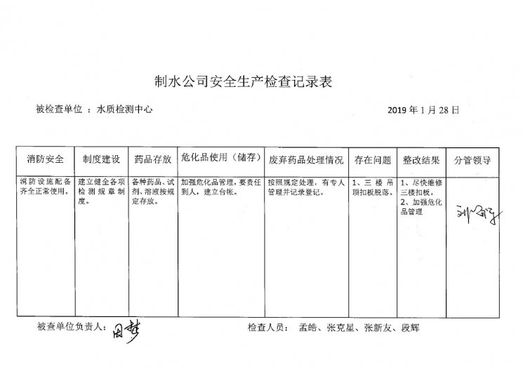 水质检测中心2019年1月安全生产检查记录