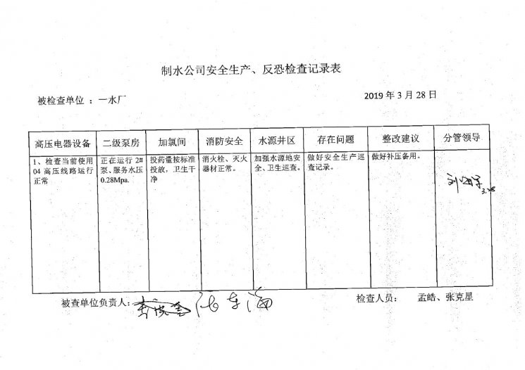 一水厂2019年3月安全生产检查记录