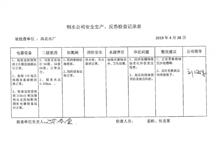 涡北水厂2019年4月安全生产检查记录