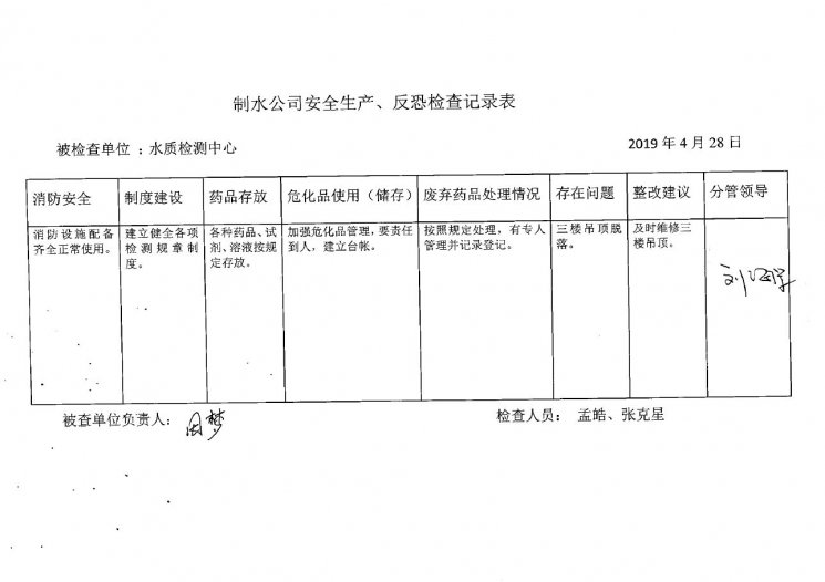 水质检测中心2019年4月安全生产检查记录