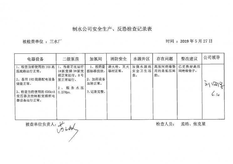 三水厂2019年5月安全生产检查记录