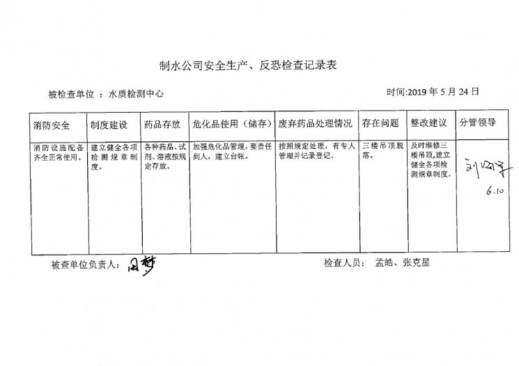 水质检测中心2019年5月安全生产检查记录