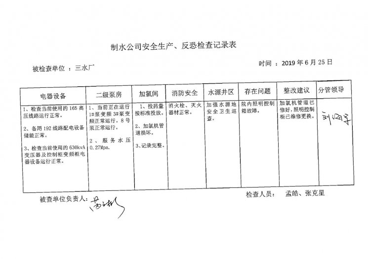 三水厂2019年6月安全生产检查记录