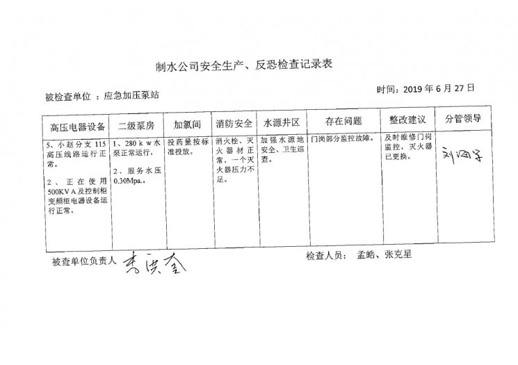 应急加压泵站2019年6月安全生产检查记录