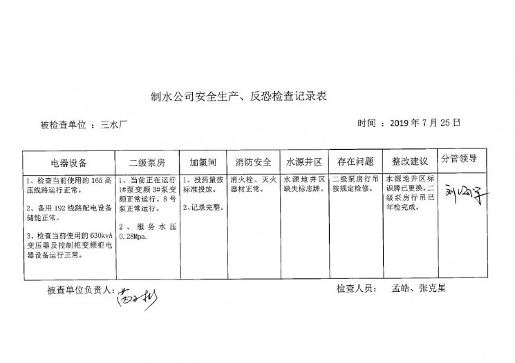三水厂2019年7月安全生产检查记录