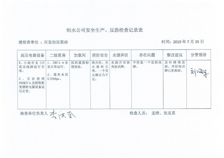 加压泵站2019年7月安全生产检查记录