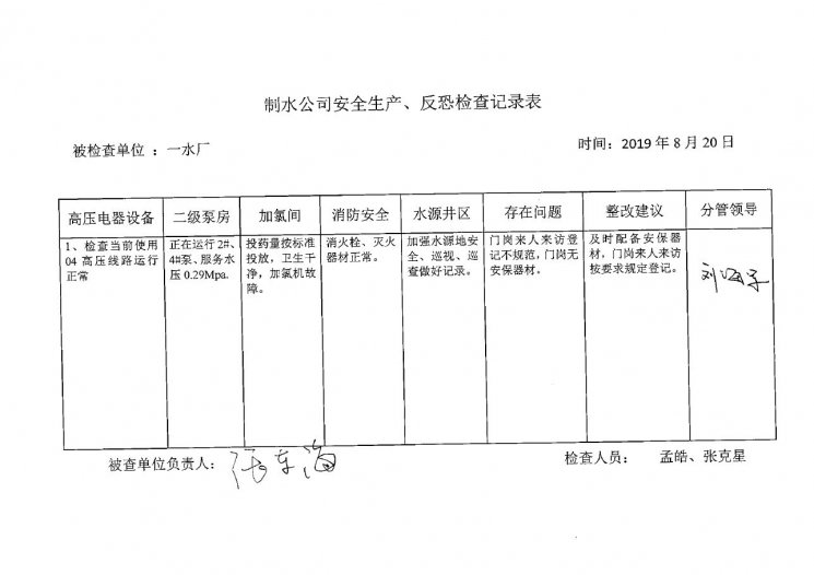 一水厂2019年8月安全生产检查记录