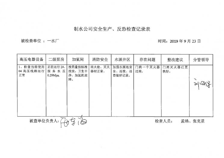 一水厂2019年9月安全生产检查记录