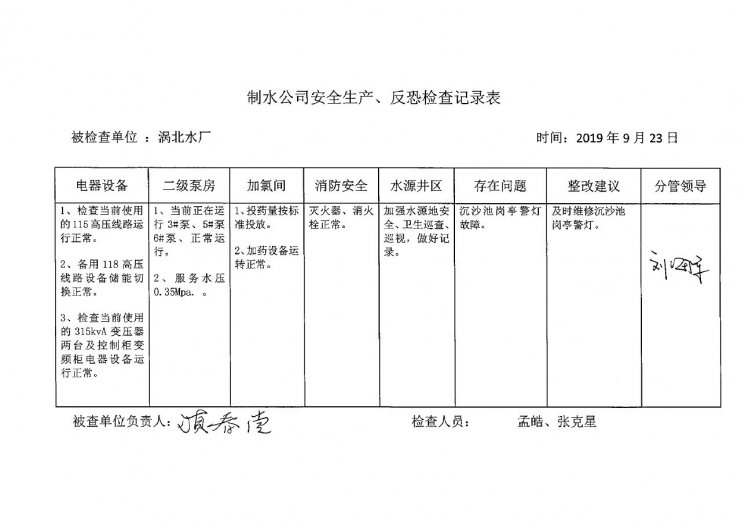 涡北水厂2019年9月安全生产检查记录