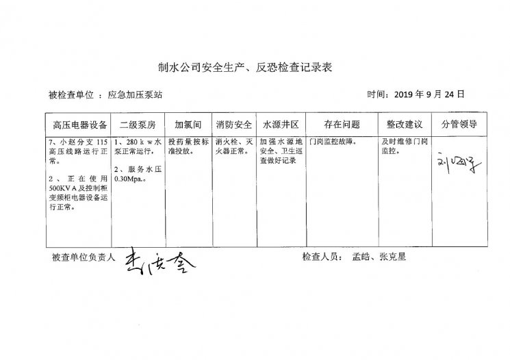 应急加压泵站2019年9月安全生产检查记录