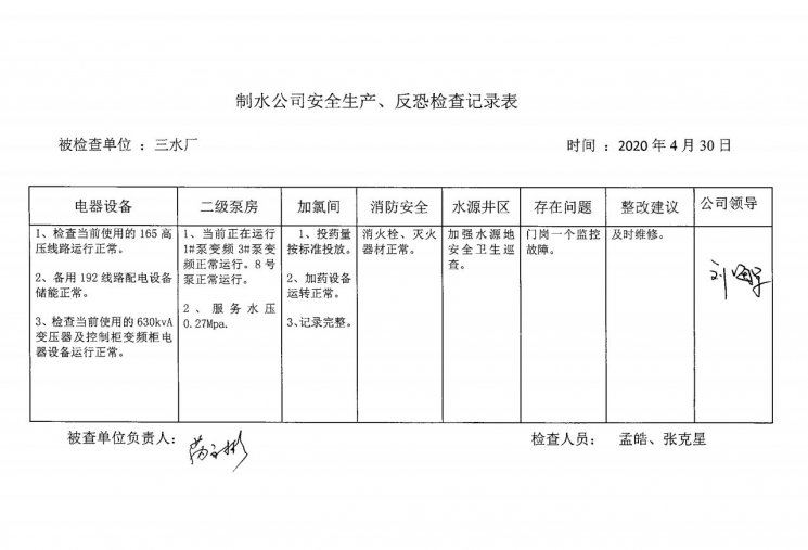 三水厂2020年4月安全生产检查记录