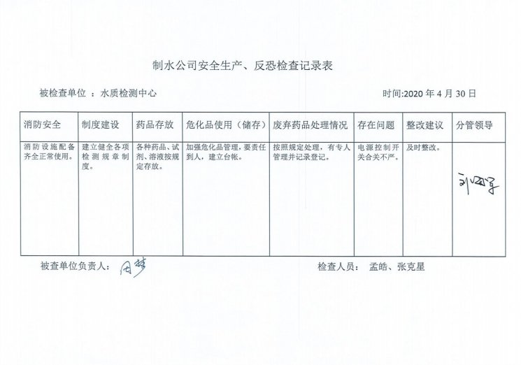 水质检测中心2020年4月安全生产检查记录