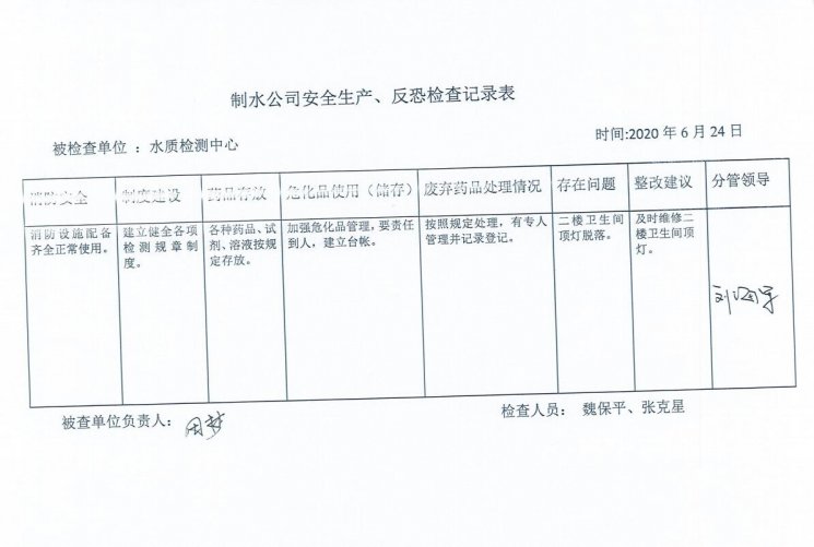 水质检测中心2020年6月安全生产检查记录