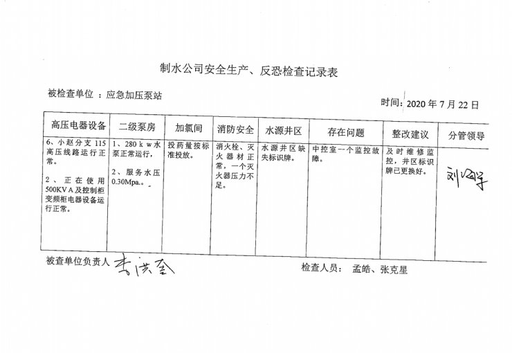 应急加压泵站2020年7月安全生产检查记录