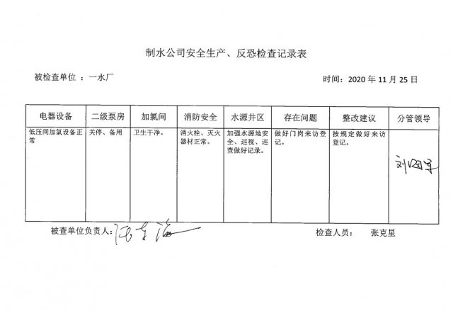一水厂2020年11月安全生产检查记录