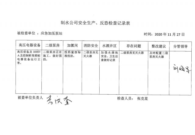 应急加压泵站2020年11月安全生产检查记录