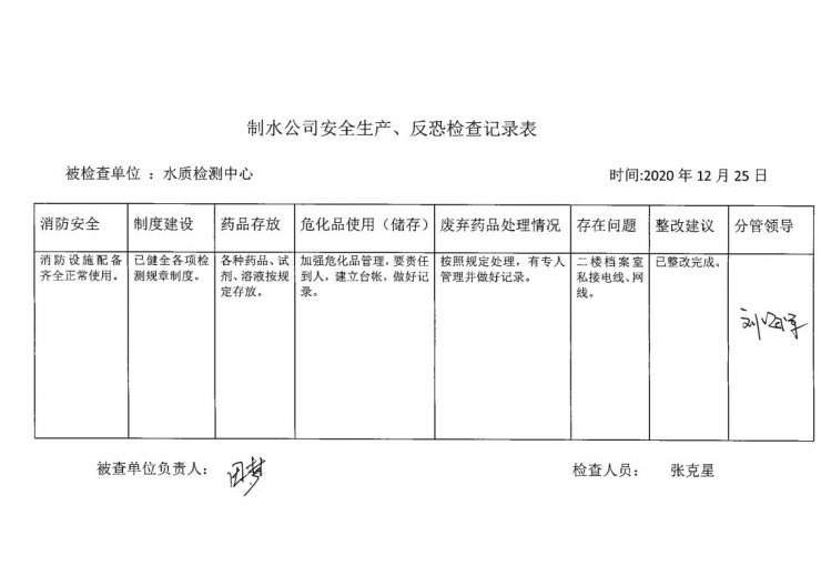 水质检测中心2020年12月安全生产检查记录