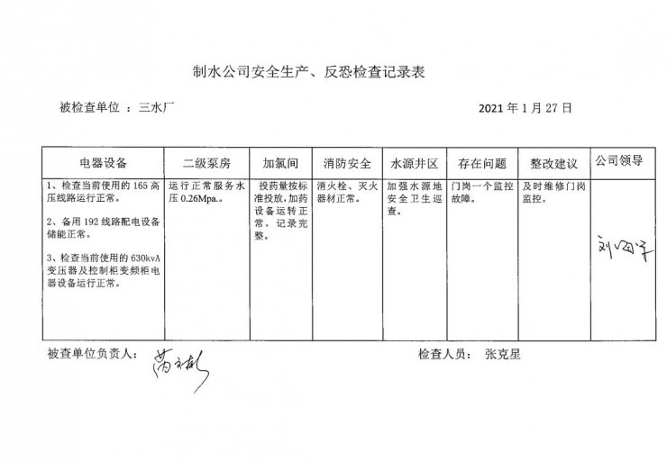 三水厂2021年1月安全生产检查记录